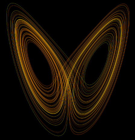 洛伦茨发现,当\(\sigma=10\)且\(b=8/3\)时,只要Rayleigh系数超过\(r\approx 24.74\),系统就会表现为"混沌",即所有的解似乎对初始条件都很敏感,几乎所有的解显然既不是周期性解,也不收敛于周期性解。换句话说,洛伦茨用一个确定性的方程告诉我们一个热力学动态系统的不可预知性。